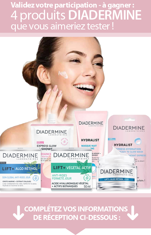 Vous avez été sélectionné pour recevoir en cas de gain un pack Diadermine. Nous vous invitons à confirmer votre participation ci-contre :